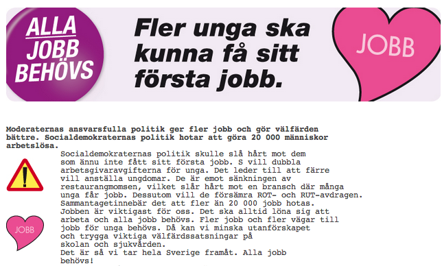 Moderaternas 10 dummaste kampanjer10. Kampanjen om att sossarnas jobbpolitik Ă€r dĂ„ligDen femte april i Ă„r lanserade Moderaterna en kampanj om bland annat att Socialdemokraternas jobbpolitik Ă€r dĂ„lig. 9. Blixtkampanjen om att Löfvens jobbpolitik Ă€r dĂ„ligDen sjunde oktober 2012 lanserade Moderaterna en âblixtkampanjâ riktad mot Socialdemokraternas ledare Stefan Löfven och hans dĂ„liga jobbpolitik. 8. Dubbelkampanjen om att sossarnas jobbpolitik Ă€r dĂ„ligDen femte oktober 2012 lanserade Moderaterna en kampanj om att Socialdemokraternas jobbpolitik Ă€r dĂ„lig. Samma dag lanserade de ocksĂ„ en annan kampanj om att Socialdemokraternas jobbpolitik för unga Ă€r dĂ„lig. 7. Kampanjen om att sossarnas vĂ€lfĂ€rdsjobbpolitik Ă€r dĂ„ligI september 2012 lanserade Moderaterna en kampanj om att Socialdemokraterna vill förbjuda vinster i vĂ€lfĂ€rden, och att det vore dĂ„lig jobbpolitik. 6. Kampanjen om att sossarnas jobbpolitik Ă€r dĂ„ligI januari 2012 lanserade Moderaterna en kampanj om att Socialdemokraternas jobbpolitik Ă€r dĂ„lig. 5. Kampanjen om att sossarnas jobbpolitik för unga Ă€r dĂ„ligDen sjunde oktober 2011 lanserade Moderaterna en kampanj om att Socialdemokraternas jobbpolitik för unga Ă€r dĂ„lig. 4. Kampanjen om att sossarnas försvars- och jobbpolitik Ă€r dĂ„ligDen sjĂ€tte augusti, mitt i valrörelsen, lanserade Moderaterna en kampanj mot pĂ„hittade socialdemokratiska nedlĂ€ggningar inom försvaret, och att dessa nedlĂ€ggningar var dĂ„lig jobbpolitik. 3. RUT- och ROT-kampanjerna om att sossarnas jobbpolitik Ă€r dĂ„ligDen femte mars 2010 lanserade Moderaterna en kampanj om att Socialdemokraterna (helt osant förvisso) ville skrota ROT-avdraget och att det vore dĂ„lig jobbpolitik. Det var bara tre dagar efter att de lanserat en annan kampanj om att Socialdemokraterna ville skrota RUT-avdraget, och att det vore dĂ„lig jobbpolitik. 2. Kampanjen om att sossarnas jobbpolitik Ă€r dĂ„ligI maj 2009 lanserade Moderaterna en kampanj om att Socialdemokraternas jobbpolitik Ă€r dĂ„lig. Socialdemokraternas ekonomiska politik var ocksĂ„ dĂ„lig, enligt kampanjen. 1. Kent Perssons âkampanjâ mot negativa kampanjerKlassisk Kent. Categories: Debattörer